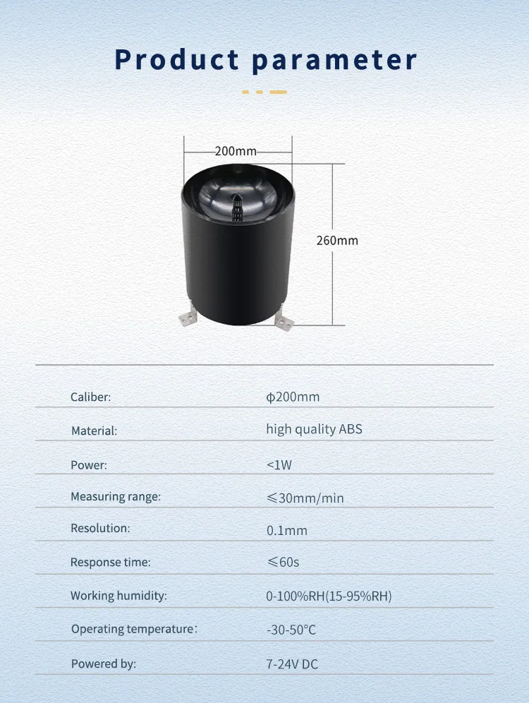 1.3 Sensor Characteristics Small size and convenient installation; High precision and good stability. Good linearity, long transmission distance and strong anti-interference ability. The funnel is designed to prevent rain, debris and other debris from flowing down the mesh hole. The tipping bucket component support system is well manufactured and has small friction torque, so the tipping bucket component has the advantages of sensitive turnover, stable performance and reliable operation. The shell of the instrument is made of ABS engineering plastic, which does not rust and has good appearance quality. The rain socket is made of ABS engineering plastic by injection molding, with high finish and small error caused by stagnant water. A horizontal adjusting bubble is set inside the chassis, which can assist the bottom corner to adjust the equipment to the best levelness.