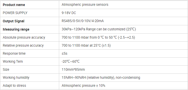 Product main technical specifications: The user provides the Atmosphere Pressure sensors with a DC power supply with an input of 9 ~ 18V. We can use the 220V AC to DC power supply provided by us, or use 12V solar panel and battery for power supply to meet the needs of different occasions.